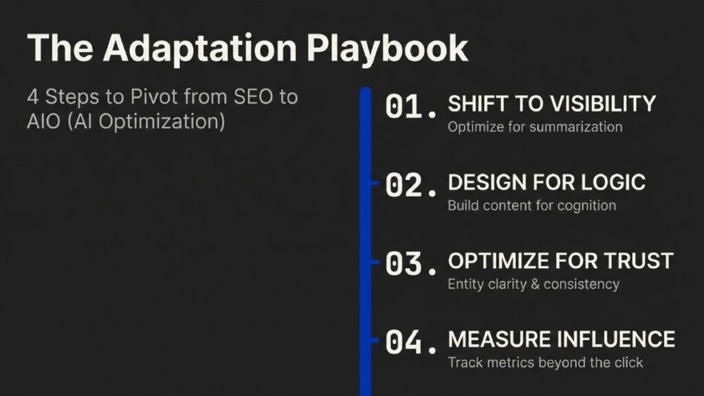 The first adjustment is strategic. Success is no longer measured in clicks, but in being selected as a source by autonomous AI agents.