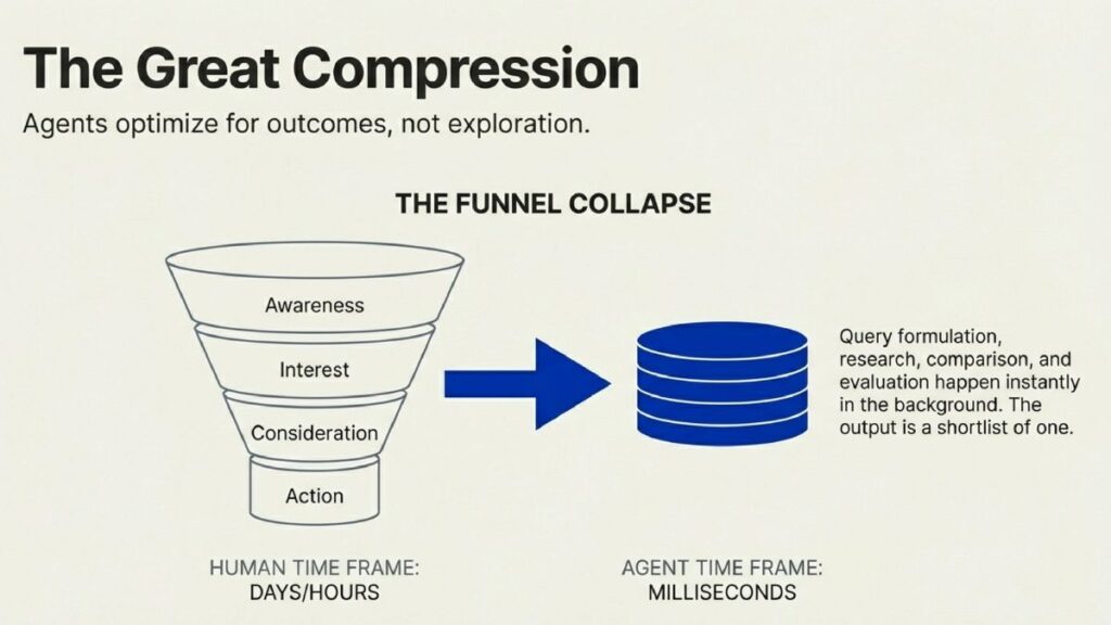 This fundamentally changes online search behavior. Instead of hundreds of impressions and dozens of clicks, the process may result in a shortlist of one or two recommendations. Brands that are not surfaced by the agent simply disappear from the decision set.