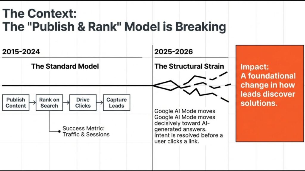 For more than a decade, digital lead generation followed a familiar pattern. Publish content, rank on search, drive clicks, capture leads, and measure success through attribution models built on traffic. That model is now under strain. With the rollout of Google AI Mode by Google, search is moving decisively toward AI-generated answers that resolve intent before a user ever clicks a link.