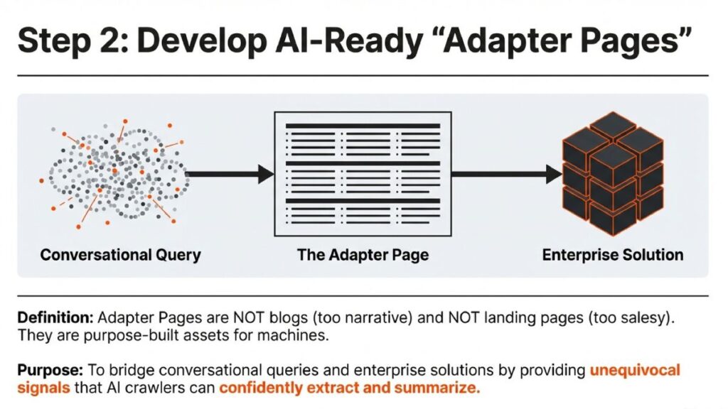 AI crawlers rely on content they can confidently extract, compare, and summarize. AI-Ready Reference Pages are purpose-built assets that bridge conversational queries and enterprise solutions. Unlike traditional blog posts (which educate) or generic landing pages (which convert), these reference pages help AI systems make unequivocal decisions about recommending or citing a brand or solution.