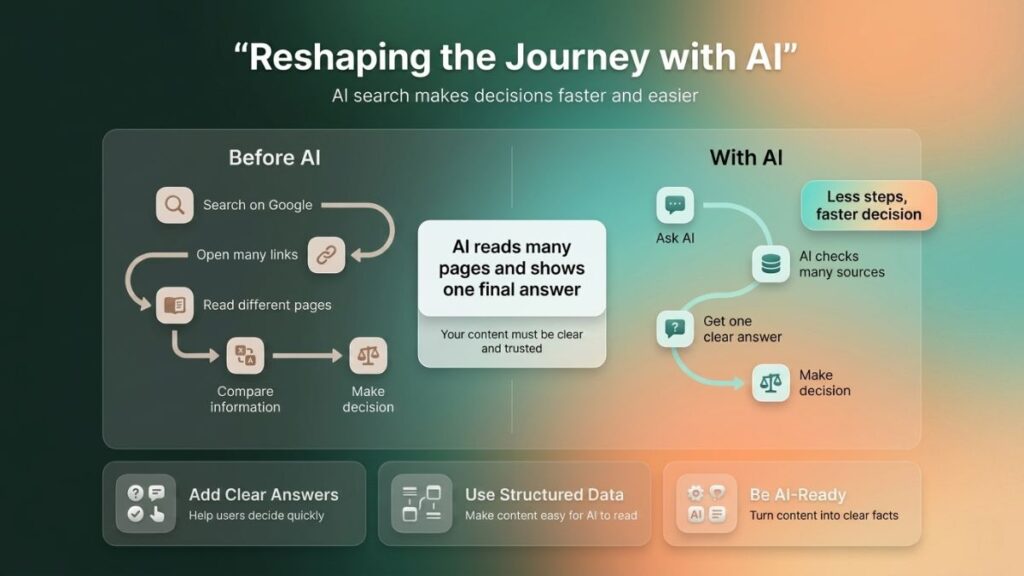 AI search engines shorten the journey. Previously, a user might click five links to find an answer. Now, the AI does the clicking for them and presents the verdict. This means your awareness content must now also contain conversion triggers.